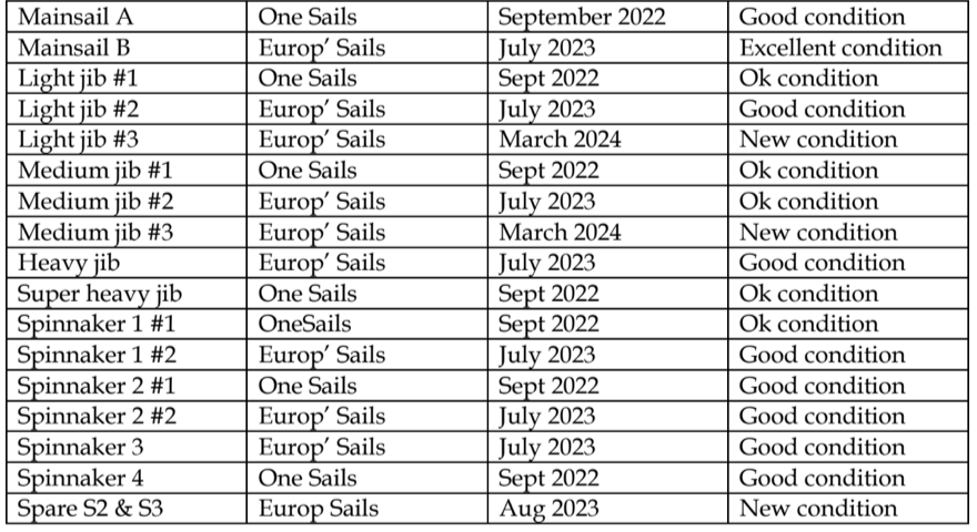Voiles : Toutes les voiles sont de la voilerie Europ’ Sails, fabriquées à partir d’une membrane Vantage1 collée et d’une surface extérieure en film :